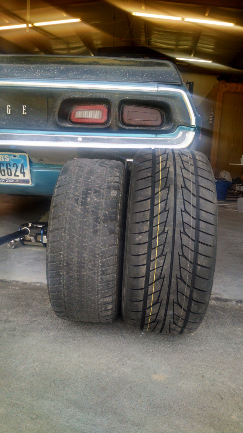 Summit Racing Legend wheels with Nitto Extreme tires. Fronts are 17x8 with 4.5" back spacing. Tires are 245/45-17. On the rear, the wheels are 17x9 with 5.0 back spacing. The tires are 255x50-17. I went with the 255's because I wanted a 27" tire to get the car up a little. 25.4" tires would drop it about 3/4" and it would be very close to not clearing my lift when I drove on. The 255's are only marginally more narrow than the 275's. I am happy with the look. I am building for a road car that handles well more than a strip car. The larger diameter tire and the larger 50 aspect will hook better than a shorter, slightly wider tire anyway.