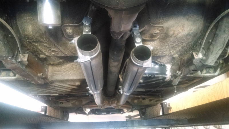 Temporary exhaust using 3" Walker RaceBullets...bit noisy but the clearance is not too bad. Passenger side header is lower than the driver's side. Makes that side lower than it should be. Not sure if that is the engine tilted that way or it is the no name headers. Tail pipes would sure help the noise under the car.