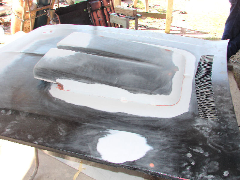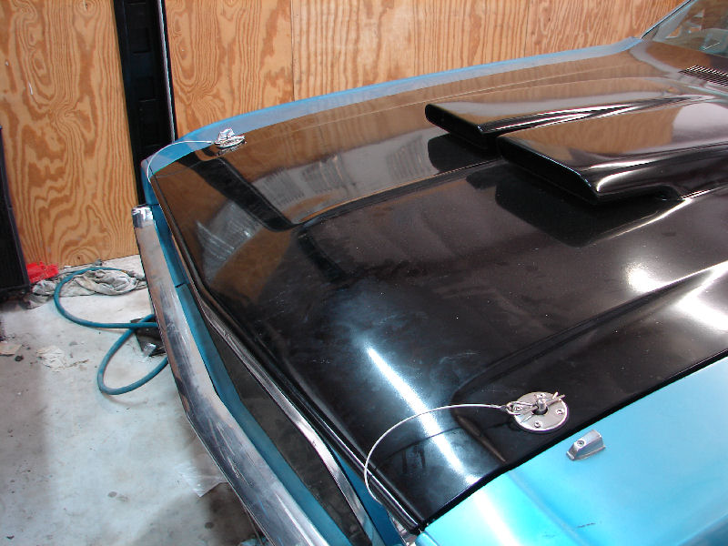 Altho I want to ultimately install a fiberglass TA hood on it, I decided to mold in the aftermarket scoop and paint the hood satin black. I spent about a million bucks on paint trying to get it to come out satin, but, I would say this is more semi gloss, but, I gave up. Added some hood pins in the picture below. It's a muscle car, after all.