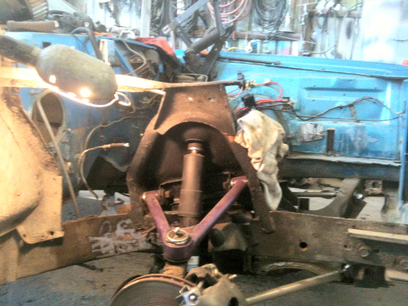 Besides the frame repairs looking suspicious, I wanted to weld up a crack in the passenger inner fender as the inner fender is a key structural piece. We found that the crack was a crack in the bondo that covered a square foot rusted out area and there was nothing to weld. New inner fender coming up!