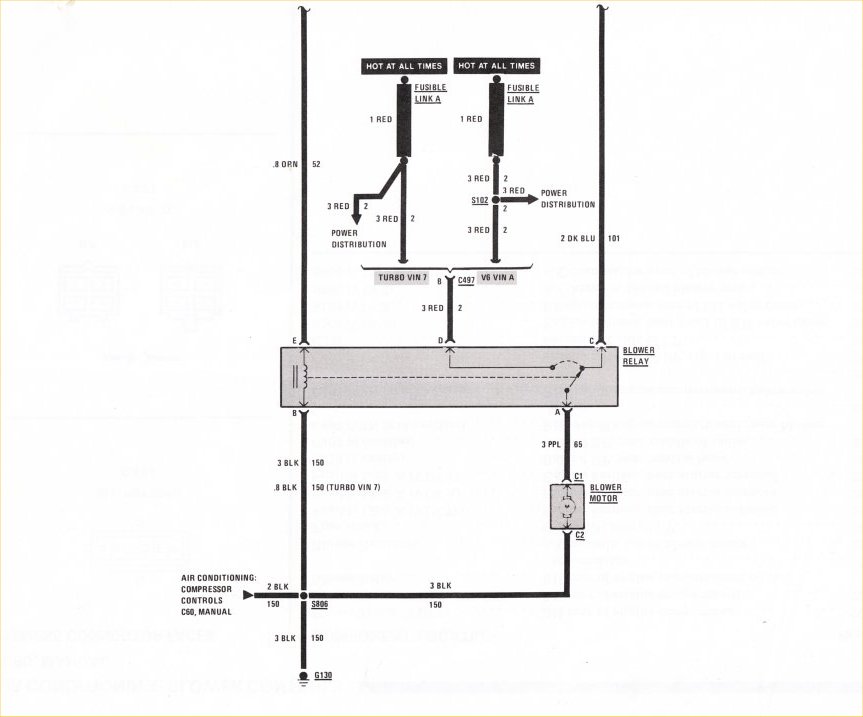 Looking at the diagram (split between two pictures) we can see that power to the blower motor follows two paths. Power for Low speed, M1, and M2 on the fan speed switch goes thru the blower resistor to the blower relay and then to the blower motor.
