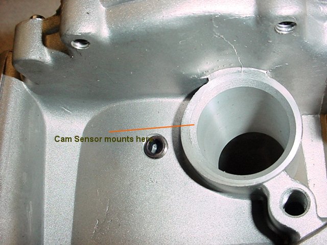 This is a picture of the top front of the cover where the cam sensor is mounted. Note the allen bolt next to the mounting hole. This must be Locktited in place so that it cannot fall into the cover, or, unscrew and allow water or trash into the front cover.