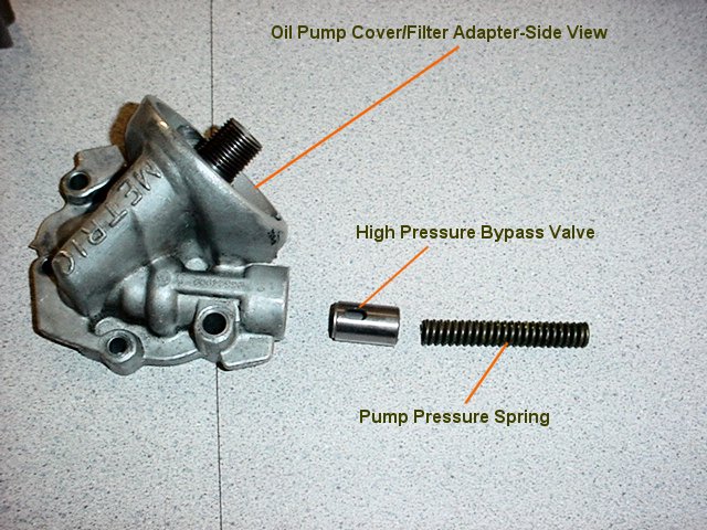 Here is a picture of the oil pump cover/filter adapter removed from the cover. Note the high pressure bypass valve and the spring that determines the bypass pressure. There is no need to have oil pressure in excess of 70 psi in a daily driver. Increasing this pressure merely wastes horsepower and increases the load on the cam sensor and front cam bearing. The yellow spring that comes in most kits is often suggested.