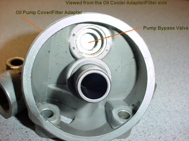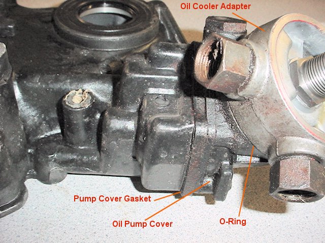 This is a close up of the oil pump gear housing, pump cover, and oil cooler adapter. The O-Ring is often a source of a leak and most vendors carry slightly larger o-rings which improve the seal. The threaded tube emerging from the adapter is what the filter screws onto. This is the piece that is replaced when one buys a "biggy" filter kit. Simply put a wrench on the nut and remove the factory threaded tube which is metric for one that has standard threads. This is a good time to replace the o-ring.