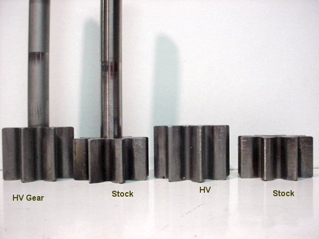 Here are pictures of both high volume and stock pump gears. The high volume gears are taller and present more area to the oil. In a high volume cover, they simply drop straight in. In a standard cover, a spacer is required between the pump cavity body and the pump cover/filter adapter.