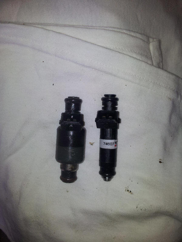Below is a picture of the 75 lb low impedance injector I pulled out compared to the "skinny" 60 lb, I installed. Both are the same length so the difference in body size makes no difference.