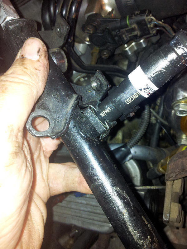 Okay, here I am holding the rail and fixing to remove the clips. Once the clips have been removed, simply grab the injectors and wiggle them out of the rail. They should slide right out.