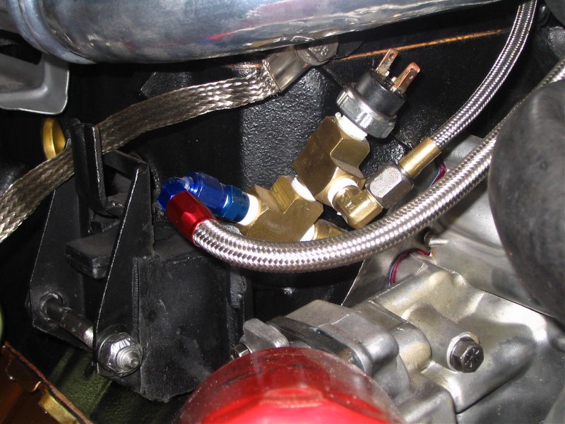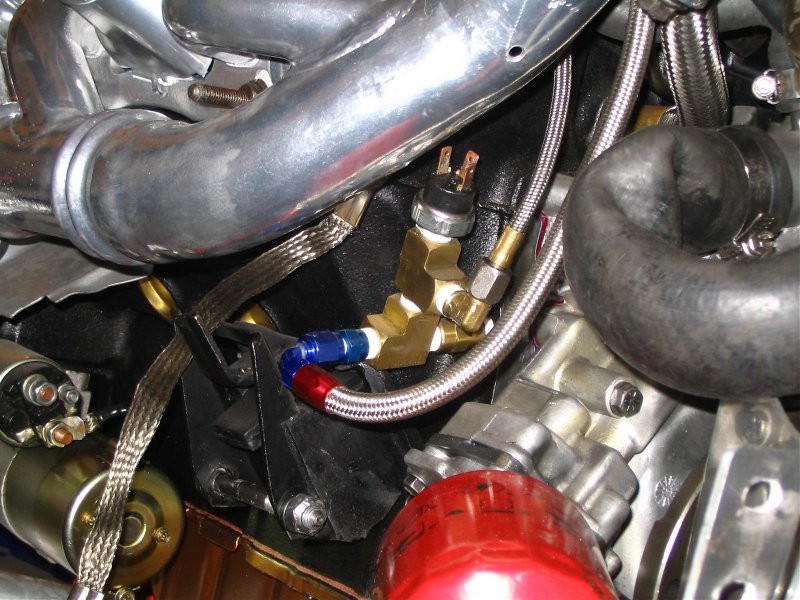 The other half of the sender works in just the opposite manner. When the pressure rises to 4 psi, the contacts in the sender close so that voltage will now pass through the sender. This side of the sender serves as a back up to the fuel pump relay. If the fuel pump relay goes bad, then when the engine has been cranked long enough to build oil pressure above 4 psi, then voltage will flow thru the sender to the fuel pump and the car will then start and run normally. This is another darned good reason to retain the factory sender. It might prevent you from having to hot wire the pump in the dark some night. Note to me, buy a brass Tee and put the factory sending circuits on the car.