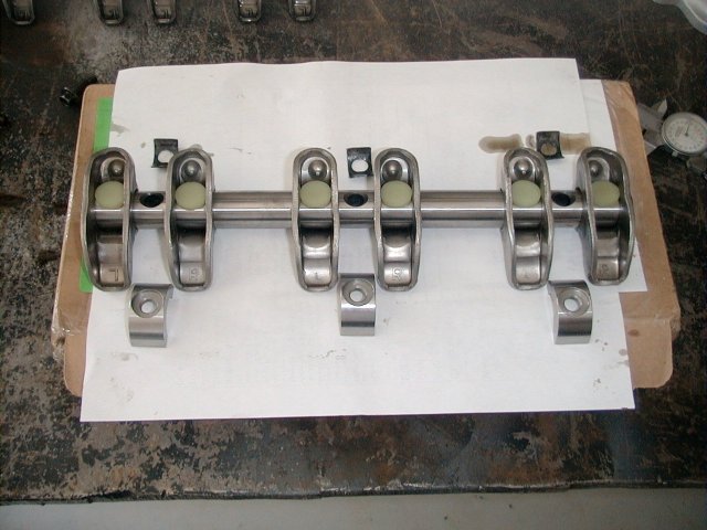 Above is the new assembly accompanied by the rocker shaft supports sold by RJC Racing and the shims I used under the shaft to correct lifter preload.