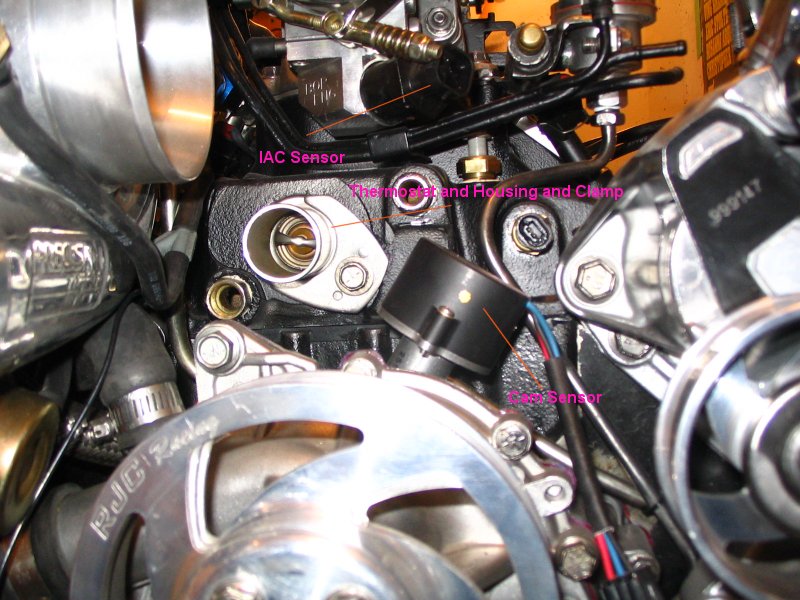 Do not over tighten the IAC Sensor as the housing may crack. Just snug it down against the gasket so there is no air leak around it. The thermostat housing is sealed with an O-Ring. It may take a lot of wiggling to get it out if it has not been removed lately. Not a bad idea to have a new housing when the thermostat is replaced in this case. Use some grease on the O-Ring on reinstall to make it easier next time. Cam Sensor install is covered under the Tech Pics section.