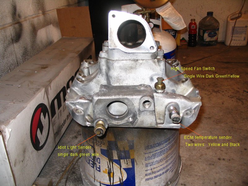Note that the Idiot light sender is the one on the passenger side of the intake. An aftermarket sender can replace this one, or Teed in here if desired. I believe the driver's side of the block also has a plug into the water jacket that may be removed and a sender installed there if one wishes to use both the light and a gauge without using a Tee in the front.