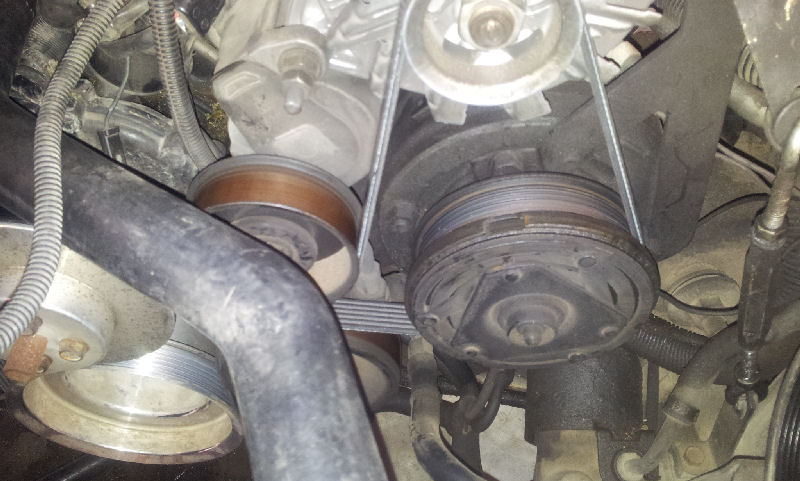 If you have good eyes, you may notice that the belt on this car is a 630 instead of the 635 I mentioned above. That is because this car has an overdrive water pump pulley and takes a shorter belt to keep the idler from hitting the ac compressor clutch after it stretches a bit. Note that this picture is on a front mount car and there is nothing in the way to stop you from quickly popping the belt off and back on.