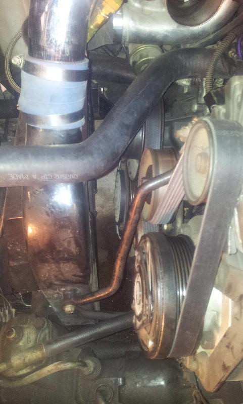 When installing the new belt get it routed around everything except the alternator pulley. Then put the wrench back on the idler pulley nut and again pull it toward you to completely release the idler tension. Slip the belt over the alternator pulley and release the pressure on the wrench to take up the slack in the pulley. When finished, you should have about one inch between the idler pulley and the AC clutch. Be sure that neither the upper radiator hose nor the turbo inlet pipe are in a position such that a pulley or alternator fan can rub/hit them.