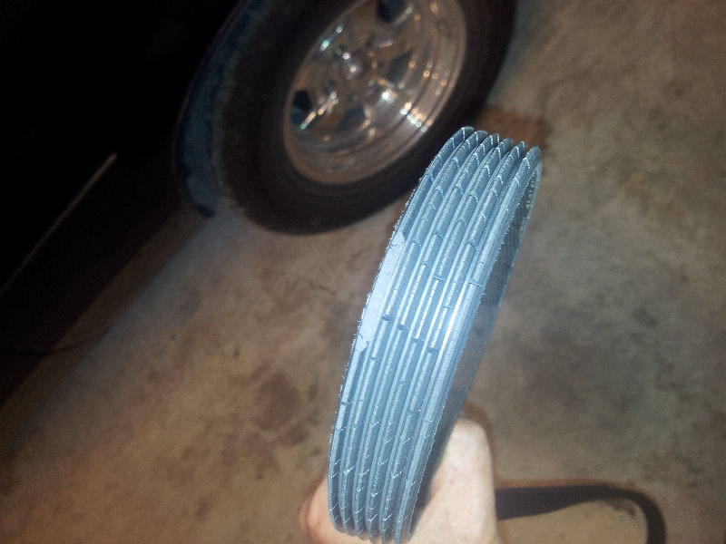 Now, if your belt looks like this, I suggest you don't wait any longer to change it. When a belt breaks, it can tear a lot of stuff up under the hood while it is flailing around. See all the cracks running across the belt? It should have been changed before it got this bad. See the chunk missing out of the side? Not good.