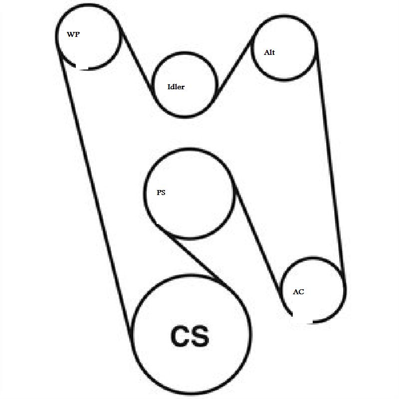 The belt routing is simple, but, if you get lost, here is a simple diagram. It is skewed as the top left small pulley is the water pump and it should be directly over the crankshaft pulley. Not drawn to scale at all but the routing is correct.