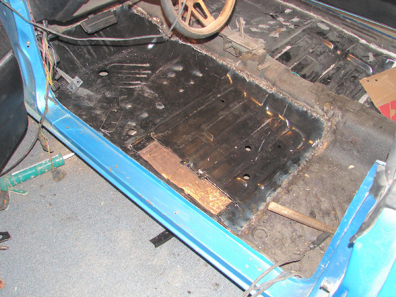 Above is passenger side floor pan after the bits and pieces that had been riveted in as patches and then smothered under a quarter inch of undercoating were cut out. Had to cut the rear floor pan out on this side as well.