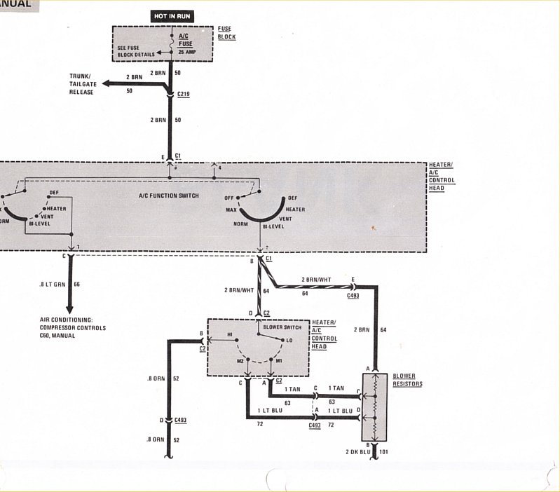 Below is the wiring diagram for the AC/Heater blower. It is a simple circuit and easy to troubleshoot. Power comes through the A/C fuse and should be present when the key is in the RUN position.