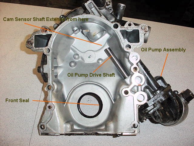 Looking at the rear of the front cover we see the external oil pump assembly and the shaft from the oil pump drive shaft emerging into the cover. This shaft is driven by the cam sensor which mounts on top of the cover and engages the top of the pump drive shaft. In turn, the cam sensor is driven by the gear on the nose of the cam shaft.