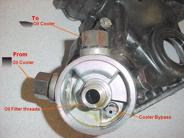 Here we look straight at the oil cooler adapter. Note that cooler bypass is not the same as the oil filter bypass. The large bolt (unlabelled) to the right hand side of the adapter covers the high pressure bypass valve that we shall see below.