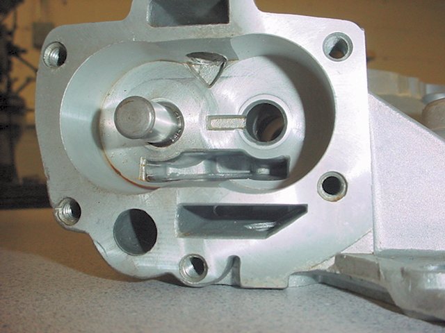 This is the rear side of a new front cover. Care should be taken to examine the cover carefully on the inside and all casting flash should be removed including the area the cam button rides. It's a good idea to check for cracks in the cover and pump cavity as well.