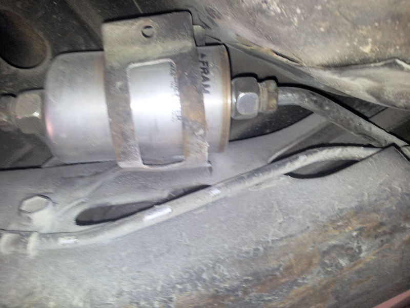 If one is not familiar with the fuel filter location, it can be a bit time consuming to find as it is tucked up inside the frame rail about two feet in front of the driver's side rear wheel behind a dropped down portion of the floor pan. As the picture shows, there is not a lot of access room to the front fitting.