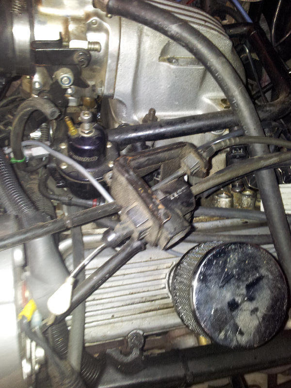 And here, I removed the throttle linkage and pulled it out of the way. Two clips on the bottom and simply push the connector at the top forward and off to disconnect the three cables. Two small bolts at the top and a bolt at the bottom to remove the bracket.