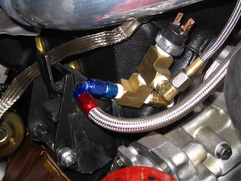 The other half of the sender works in just the opposite manner. When the pressure rises to 4 psi, the contacts in the sender close so that voltage will now pass through the sender. This side of the sender serves as a back up to the fuel pump relay. If the fuel pump relay goes bad, then when the engine has been cranked long enough to build oil pressure above 4 psi, then voltage will flow thru the sender to the fuel pump and the car will then start and run normally. This is another darned good reason to retain the factory sender. It might prevent you from having to hot wire the pump in the dark some night. Note to me, buy a brass Tee and put the factory sending circuits on the car.