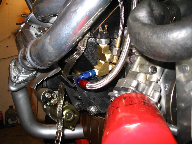 David used a metal braided hose to provide pressure to the oil pressure gauge that is mounted inside the car instead of the small nylon tubing that normally is provided with the gauges from the gauge manufacturer. He also used a metal braided hose to replace the hard line oil supply tube that provides oil to the turbo. Do Not use a flexible turbo oil drain line. Those usually don't drain oil fast enough out of the engine and will cause oil to back up in the turbo which is not good.