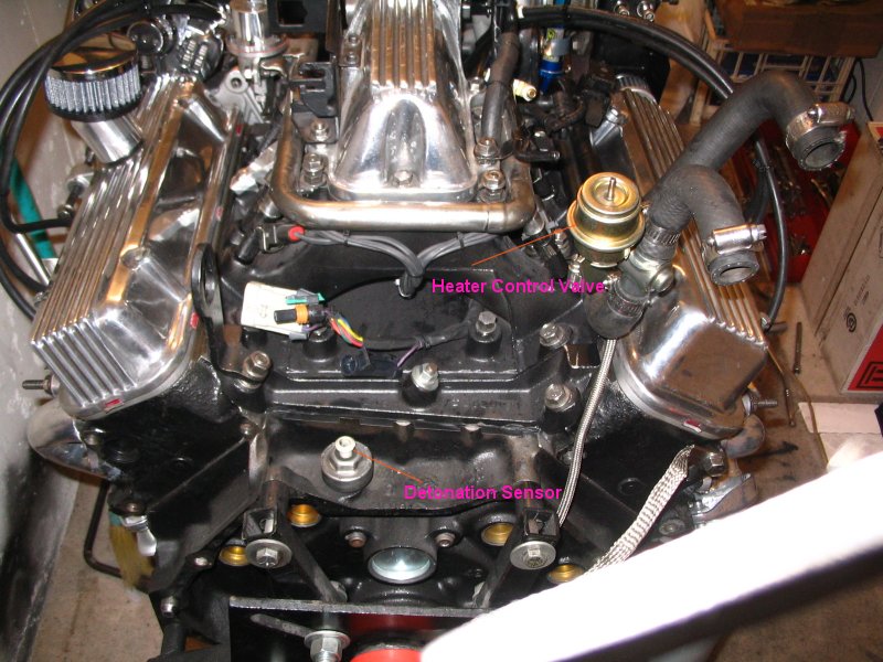Note that the Idiot light sender is the one on the passenger side of the intake. An aftermarket sender can replace this one, or Teed in here if desired. I believe the driver's side of the block also has a plug into the water jacket that may be removed and a sender installed there if one wishes to use both the light and a gauge without using a Tee in the front.